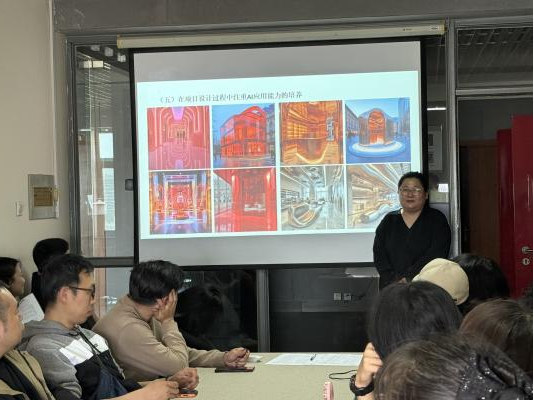 刘桐分别从走访企业基本情况、访企拓岗内容和教学反思等方面展开。她说从走访企业基本情况快来看,为应对新一轮人才培养方案修订,掌握产业人才需求趋势。2024年暑期,艺术与科技专业骨干教师赴广州、深圳、东莞地区开展产业人才需求调研暨“访企拓岗”专项活动,通过与企业高层管理者、技术精英及人力资源战略伙伴的深度座谈,共同绘制了行业发展的新蓝图,探讨新兴技术的广泛应用,并对学生实践创新能力与综合素养的精准培育提出了高标准、严要求。从走访内容上刘桐老师说,数字展示行业受国家经济影响较大,为适应市场变化,企业需拓展新业务领域,设计方案注重展馆的自造血能力,元宇宙产品已逐渐成熟应用于市场。最后,在走访中刘桐老师不断进行教学反思,她说专业发展和人才培养方面除了培养基本的展示空间设计、策划设计师、平面设计师之外,还可以培养数字空间设计师、多媒体交互设计师等方面的人才,为与企业用人高度契合,调整优化软件技术方面的课程(如增设SU、UE等软件课程)注重一专多能的复合型人才培养。