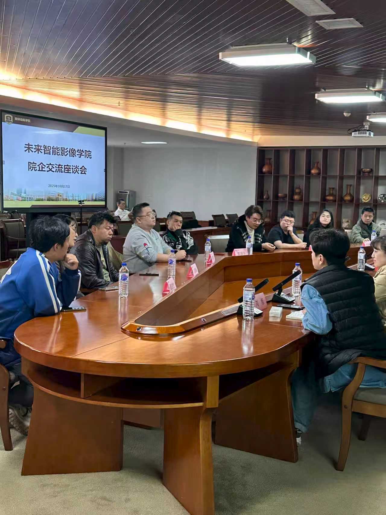 10月17日,未来智能影像学院召开了2025年院企交流座谈会,邀请北京若森数字科技有限公司、杭州墨启时空科技有限公司、吉林省鑫动传媒有限公司、长春博恩展览展示有限公司四家企业代表进校座谈,旨在深化院企协同育人机制,探索智能影像领域合作新路径。学院院长助理袁锐主持座谈会,学院领导班子全体人员参会。